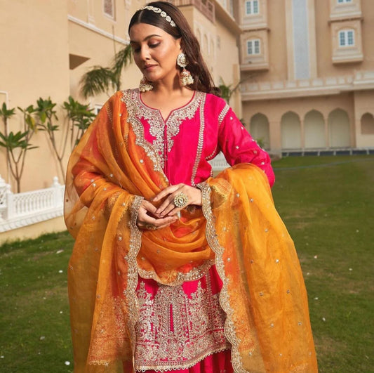 Partywear Hot Pink Silk Blend Zari Embroidered Peplum Dhoti Suit