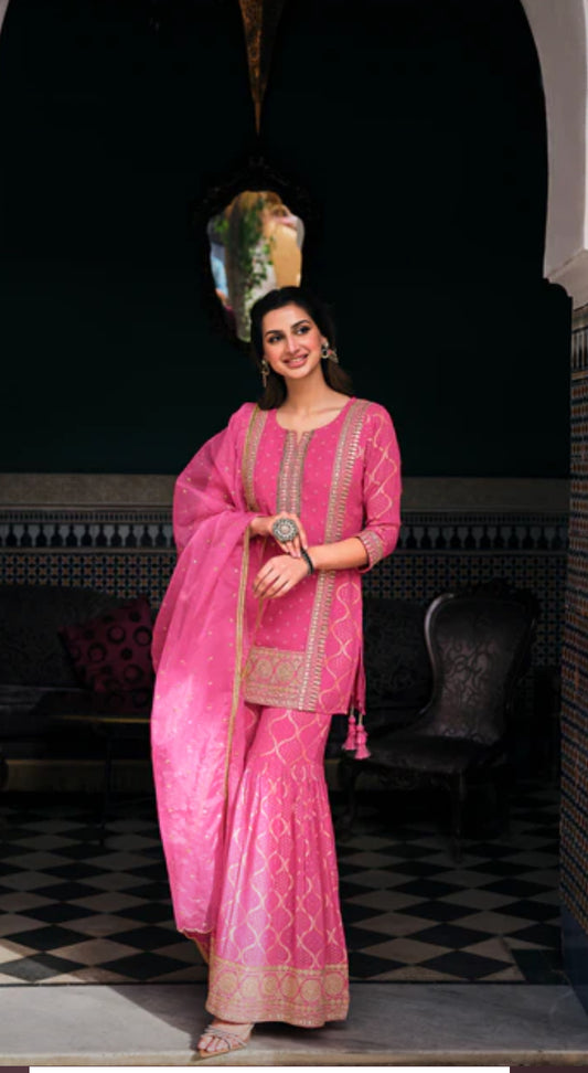 Pink Viscose Georgette Sharara Suit With Leather Work & Zari Embroidery