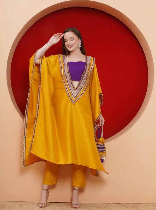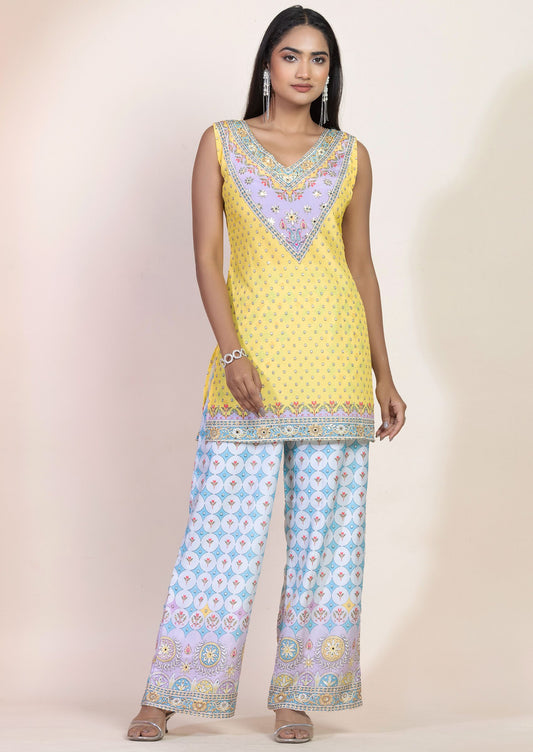 Yellow Printed Swarovski Embellished Kurta Set With Palazzo And Cape