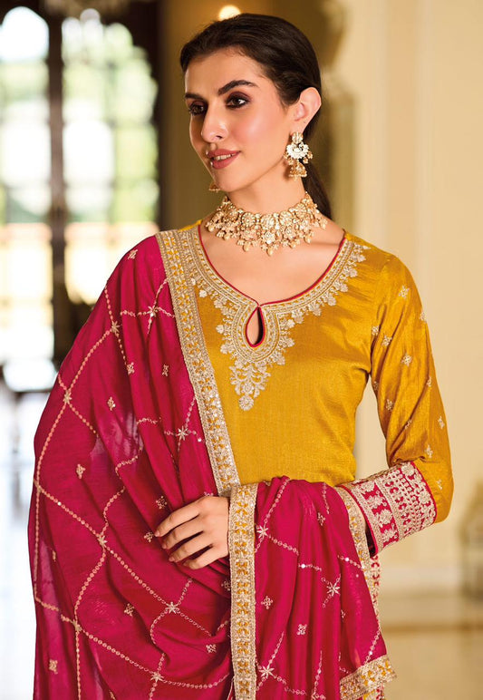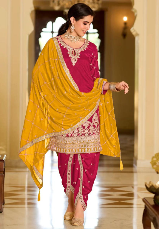 Yellow & Magenta Zari Embroidered Punjabi Suit With Tulip Pants