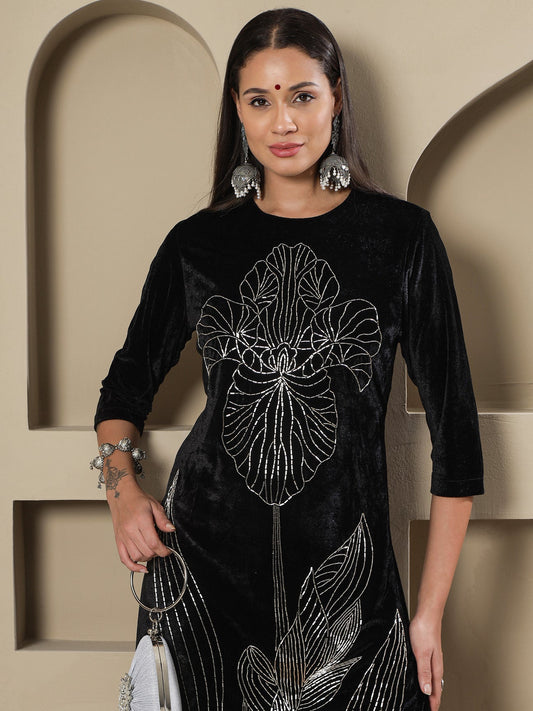 Designer Partywear Black Velvet Hand-Embellished Long Straight Shirt With Pants