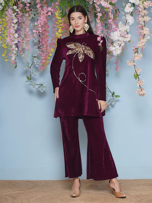 Maroon Velvet Co-ord Set With Embroidery And Mirror Work