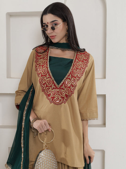Partywear Dull Gold Shimmer Chinnon Kurta With Farshi Salwar and Dupatta