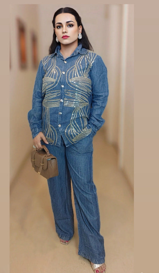 Partywear Soft Denim Coord Set With Sequins Embroidery