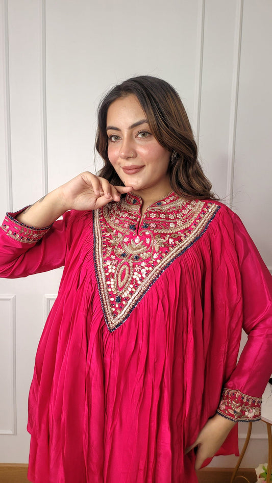 Hot Pink Pure Crepe Peplum Top With Dhoti Drape Skirt