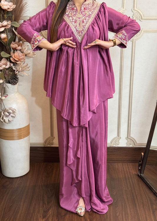 Rose Mauve Pure Crepe Peplum Top With Dhoti Skirt