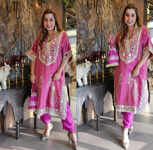Pure Crepe Printed Kaftan With Dhoti Pants With Mirror Work