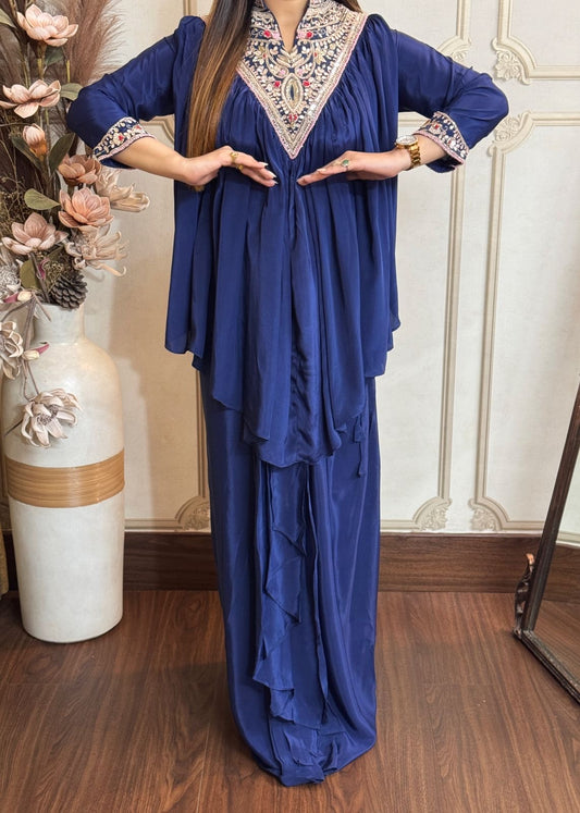 Navy Blue Pure Crepe Peplum Top With Dhoti Skirt