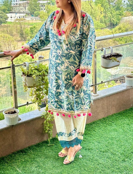 Printed Cotton co-ord set with realmirror, pom pom and crotia lace with potli