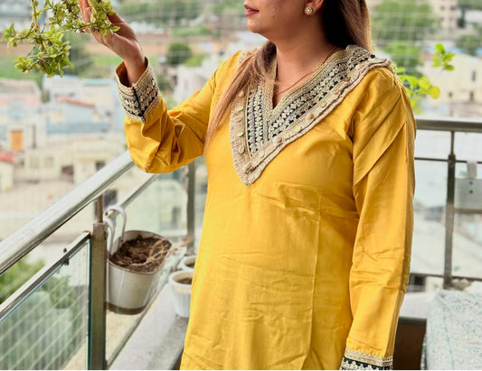 V-Neck Yellow Embellished Cotton Linen Co-ord Set