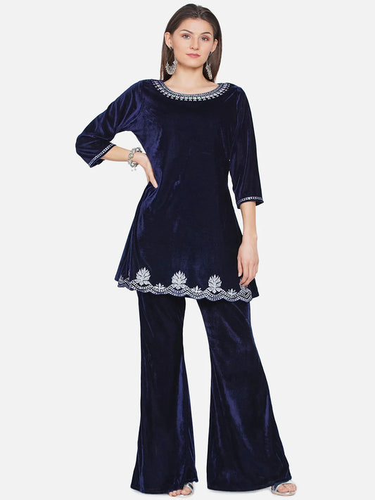 Navy Blue Velvet Kurta with Bell bottom Pants
