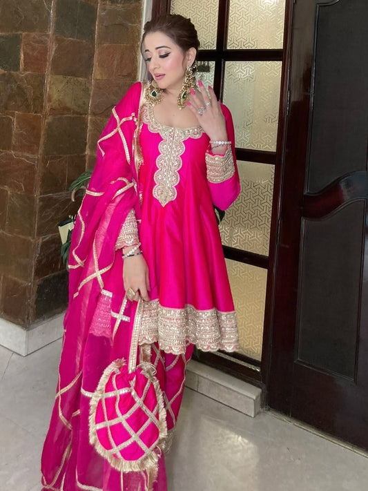 Hot Pink Designer Partywear Silk Short Anarkali Suit With Gota Work