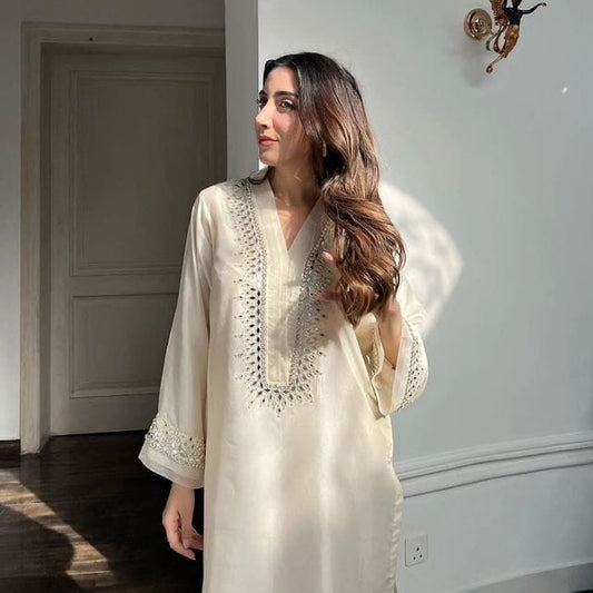 Celebrity Inspired Designer Shimmer Organza Long Dress With Embroidery and Mirror Work Detailing