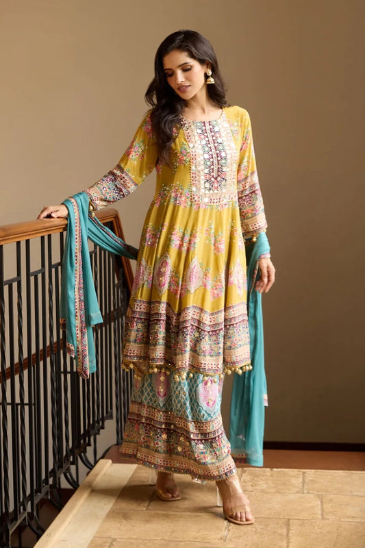 Yellow Pure Crepe Ethnic Printed Sharara Set