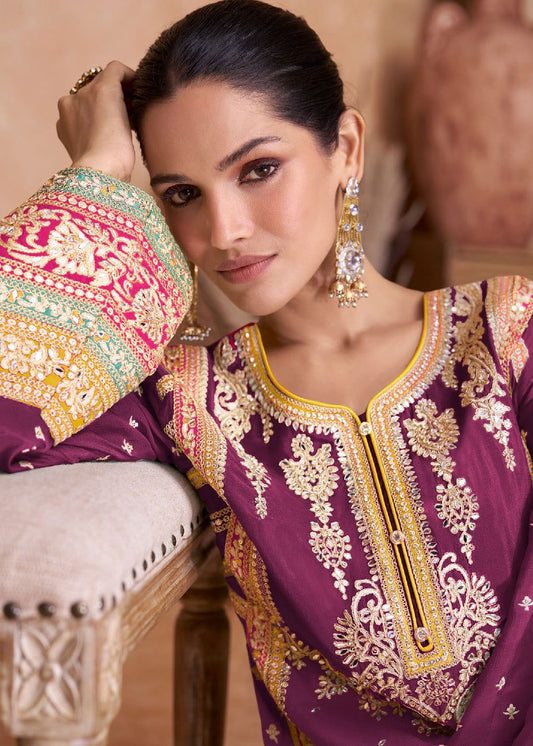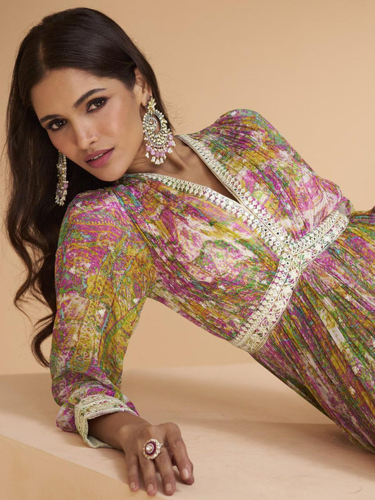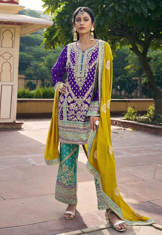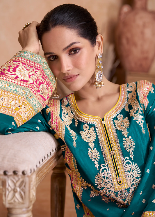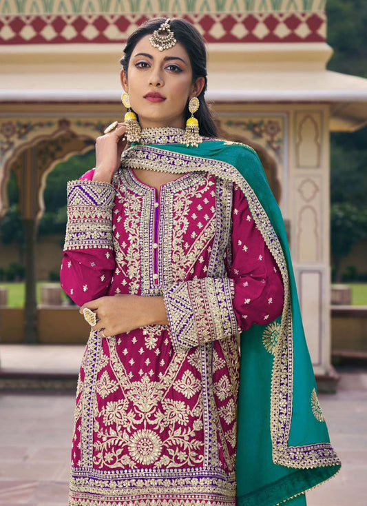 Magenta & Aqua Green Zari Embroidered Kurta Pant Set