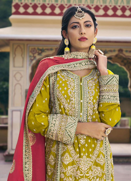 Mehendi Green & Dark Green Zari Embroidered Kurta Pant Set