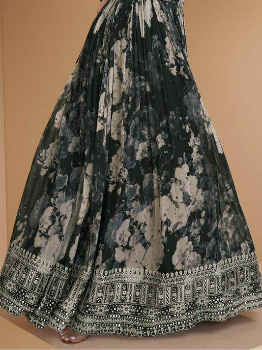 Partywear Grey & Black Faux Georgette Gown With Waist Belt