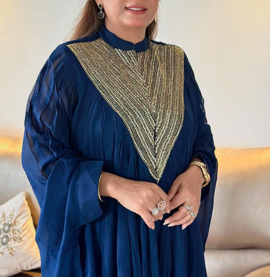 Royal Blue Premium Satin Cowl Dress With Handwork On Collar & Sleeves