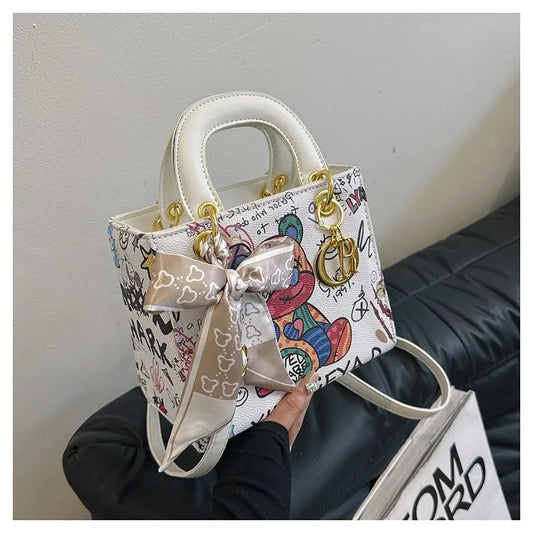 Imported Designer Boss Lady Crossbody Handbag with Graffiti and Silk Scarf