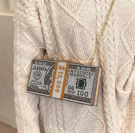 Partywear Grey 10K Dollar Clutch With Rhinestones & Sling Chain