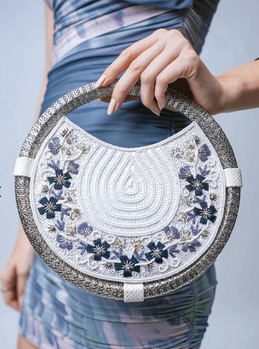 Women's White & Navy Blue embroidered whirl round partywear clutch bag