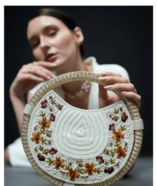 Women's White & Gold embroidered whirl round partywear clutch bag