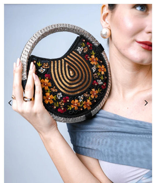 Women's Black & Gold embroidered whirl round partywear clutch bag