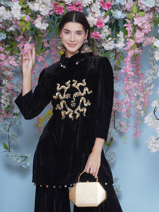 Designer Partywear Black Velvet Hand Embellished Kurta and Sharara Set