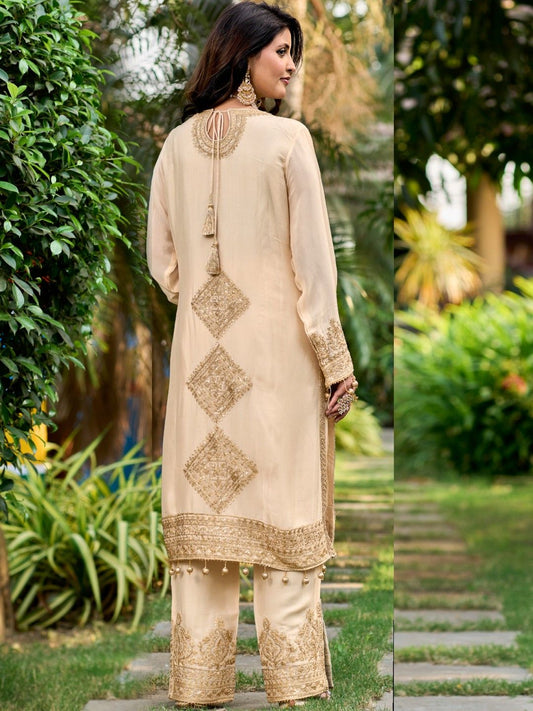 Partywear Cream Silk Blend Heavy Zari Embroidered Pakistani Suit
