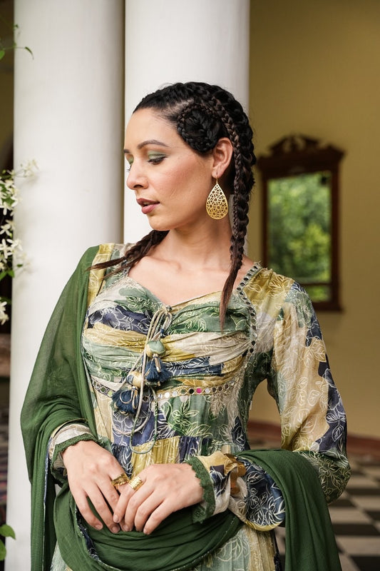 Dark Green Digital Print Chinon Nyra Cut Kurti Pant Set With Dupatta