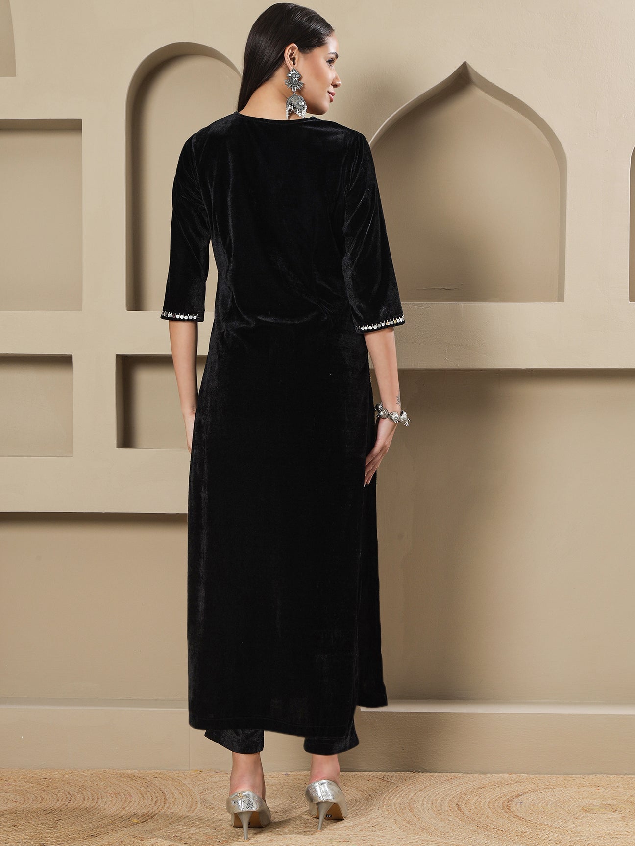 Designer Partywear Black Velvet Hand-Embellished Long Straight Shirt With Pants