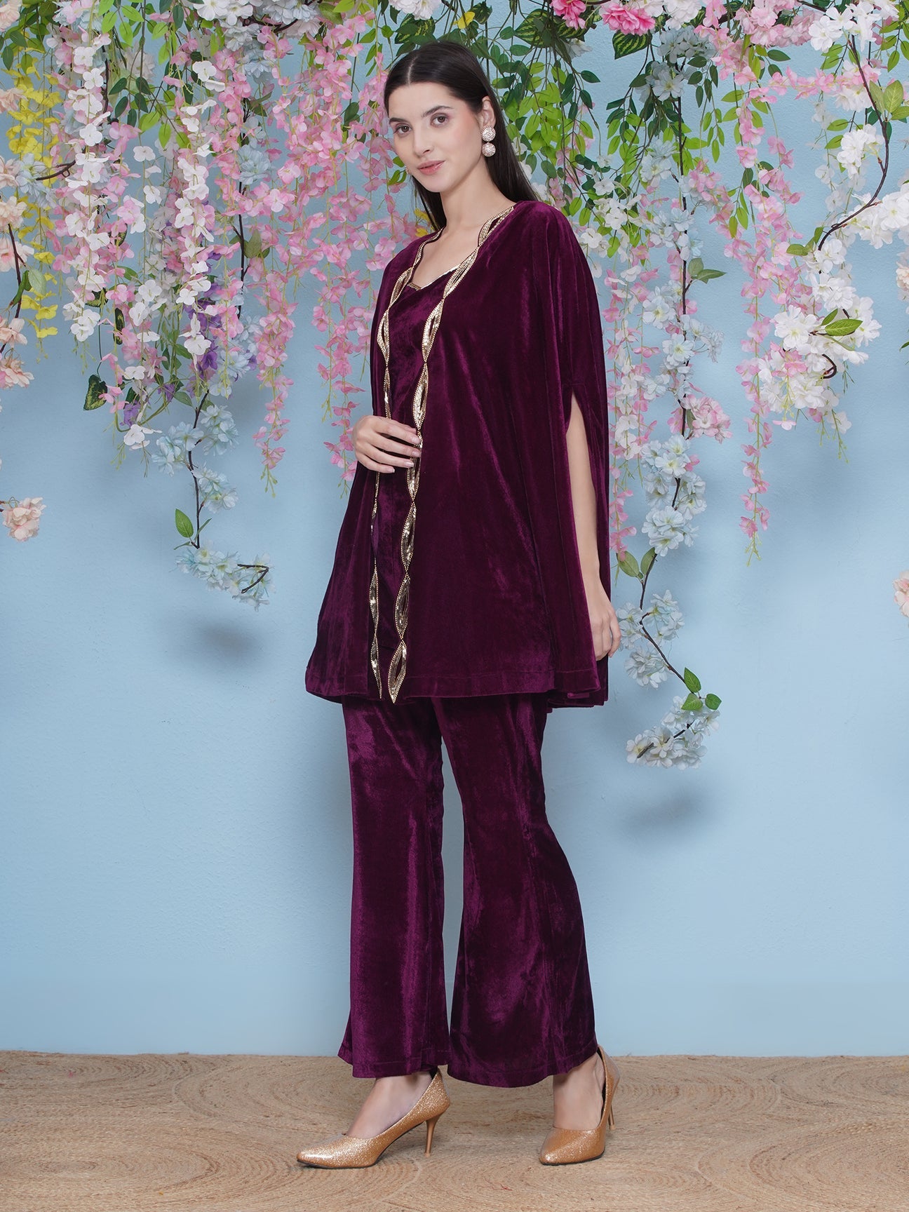 Designer Partywear Wine Velvet Hand Embellished Cape With Inner and Bellbottom Pants