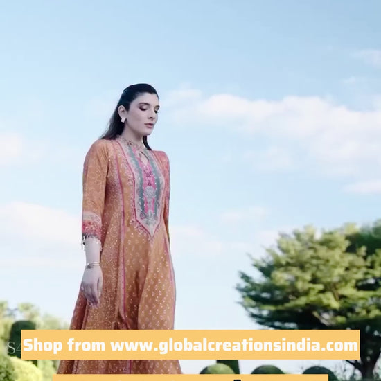 This flowing tangerine Anarkali glows in festive prints and luxe crepe— designed for radiant Eid evenings and sunlit festive moments