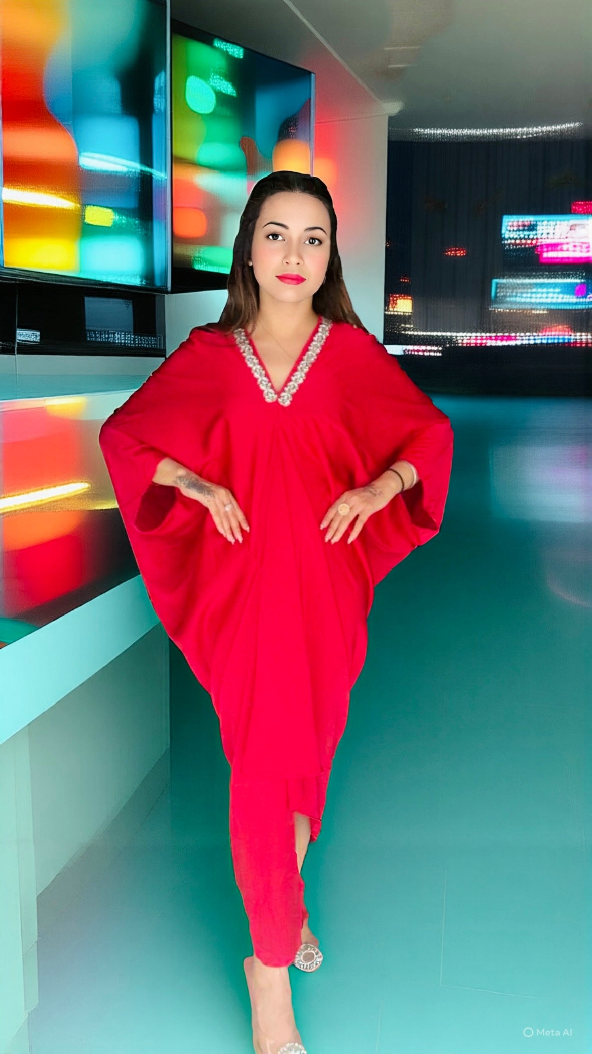Imported Premium Satin Rhinestone Neckline Kaftan Dress