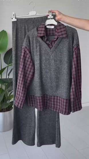 Elevate your everyday style with our Plaid Knit Luxe Set — a perfect blend of comfort and class. Featuring a soft ribbed knit vest paired with flared knit trousers and a checkered shirt, this ensemble is designed for effortless sophistication. Whether you choose olive grey, cocoa brown, or charcoal, each look brings warmth, structure, and timeless appeal to your wardrobe.