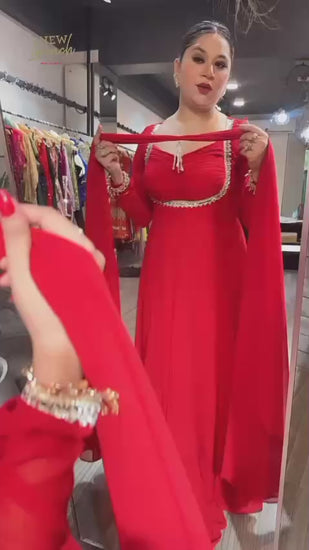 Red Designer Partywear Georgette Anarkali Suit With Lace Detailing & Tassels