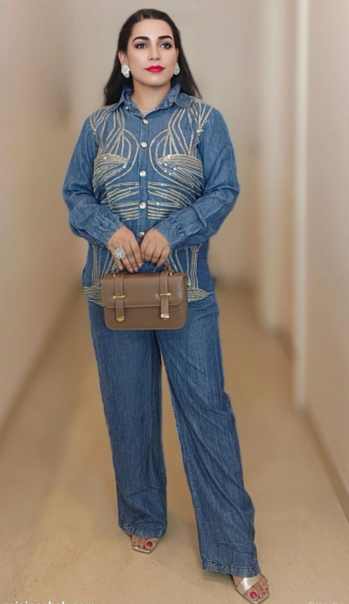 Beautiful and stylish soft denim coord set with sequins and thread embroidery available in sizes from 38 to 50